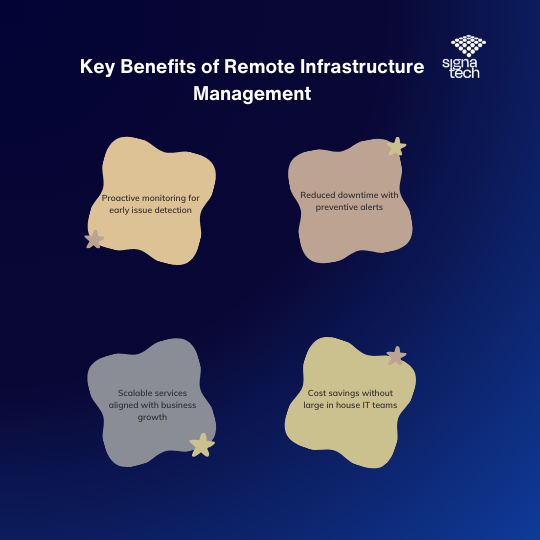 Adopting remote infrastructure management delivers measurable advantages that directly impact efficiency and profitability. Some of the most important benefits include: